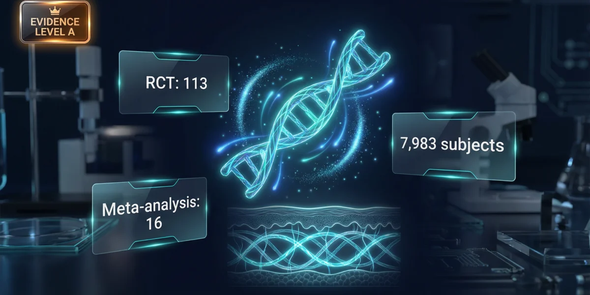 コラーゲンは人体で最も豊富なタンパク質であり、皮膚・骨・軟骨・筋肉・血管など全身の結合組織の主要構成成分です。加齢とともにコラーゲン産生量は低下し、皮膚の弾力性低下・しわの増加・関節軟骨の劣化・筋肉量の減少などが生じます。2026年に発表されたアンブレラレビュー(16件のメタ分析・113件のRCT・7,983名を統合)では、コラーゲン補給が皮膚弾力性・水分保持・筋骨格系健康に一貫した有益な効果を示すことが確認されました。