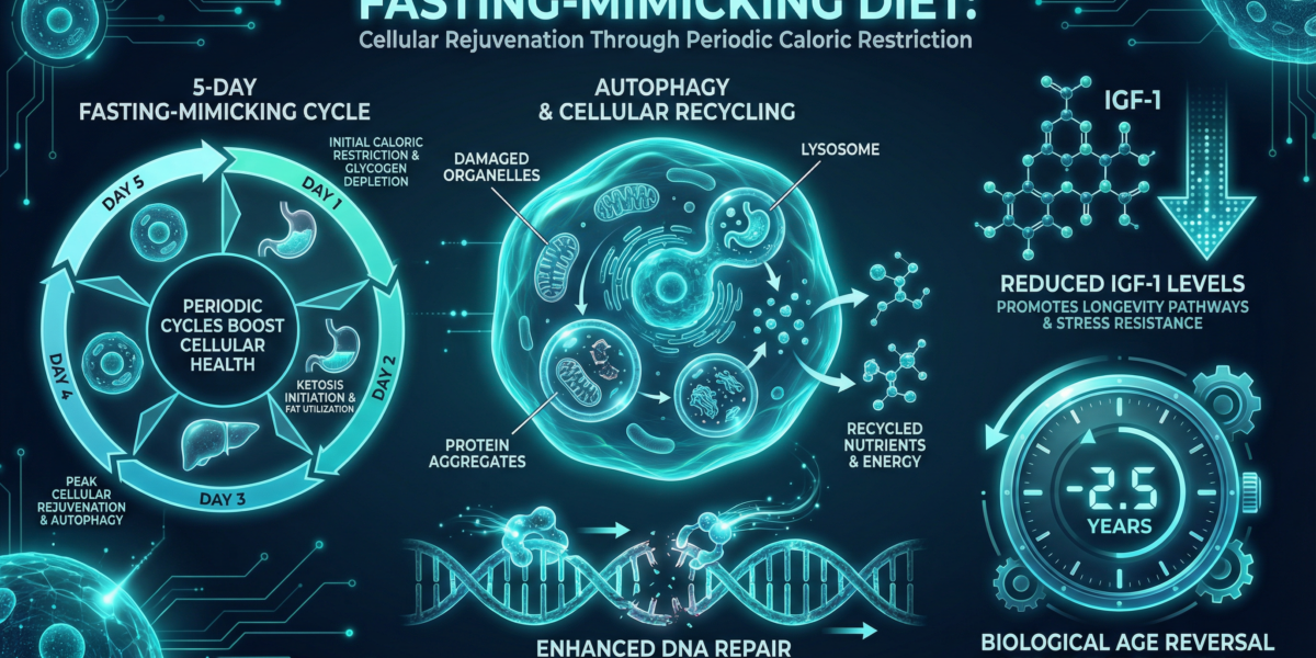 擬似断食(Fasting-Mimicking Diet、FMD)は、通常の食事を摂りながらも、体が断食状態にあると認識させるように設計された食事法です。具体的には、月に5日間、低カロリー、低タンパク質、高不飽和脂肪酸の食事を摂取します。この食事法は、細胞の自己修復プロセスであるオートファジーを誘導し、健康寿命の延伸に寄与する可能性が研究によって示唆されています。
