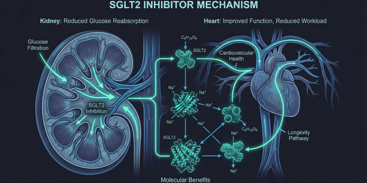 SGLT2阻害薬は、腎臓の近位尿細管でのグルコース再吸収を阻害し、尿中へのグルコース排泄を促進することで血糖値を低下させます。これにより、カロリー制限と同様の状態を体内で作り出し、mTORC1の抑制やAMPKの活性化といった長寿関連経路に影響を与えることが示唆されています。